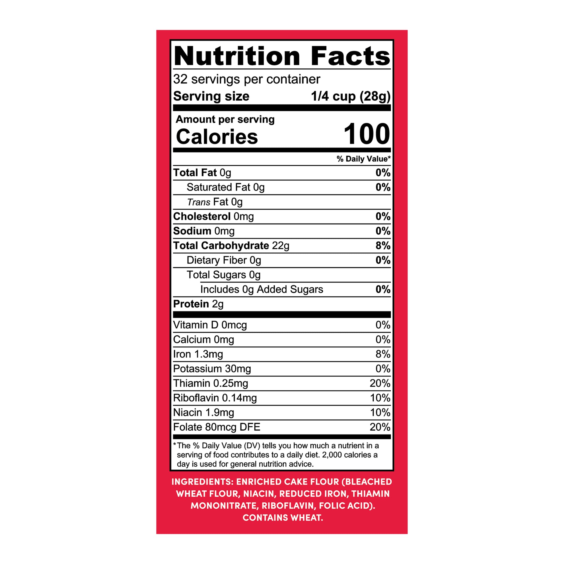 ENRICHED CAKE FLOUR (BLEACHED WHEAT FLOUR, NIACIN, REDUCED IRON, THIAMIN MONONITRATE, RIBOFLAVIN, AND FOLIC ACID).
